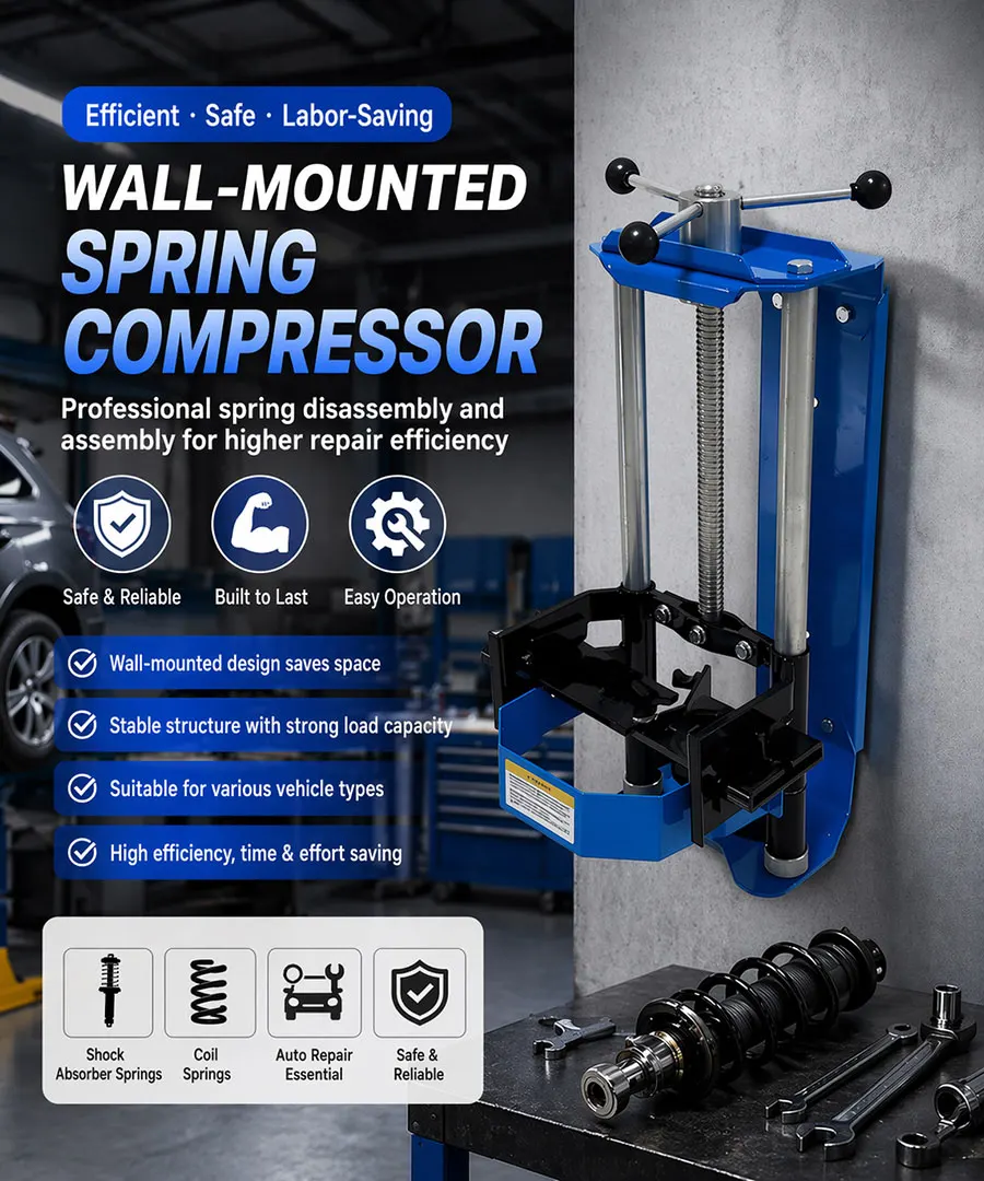 The Wall-Mounted Spring Compressor is a heavy-duty tool designed for safely compressing and removing suspension springs from vehicles. Mounted securely to the wall, it provides a stable and space-saving solution for automotive workshops, garages, and tire service centers.